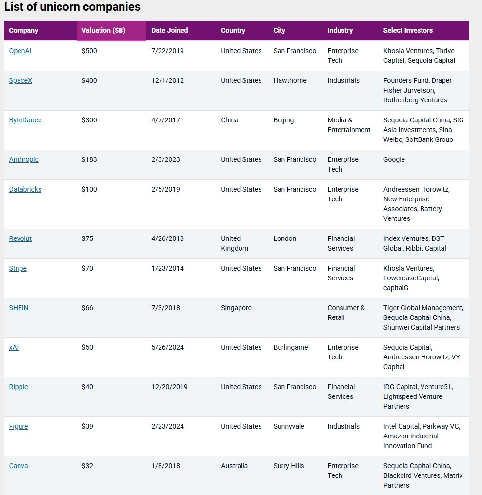 SpaceX’in 2026 yılında halka arzının gündeme gelmesi ile dünyanın en değerli stratup’larını (Upstart’larını) aşağıda paylaşıyorum (Kasım ayı verilerine göre). 2026 yılı global tarafta halka arz açısından güzel bir yıl olmaya aday.