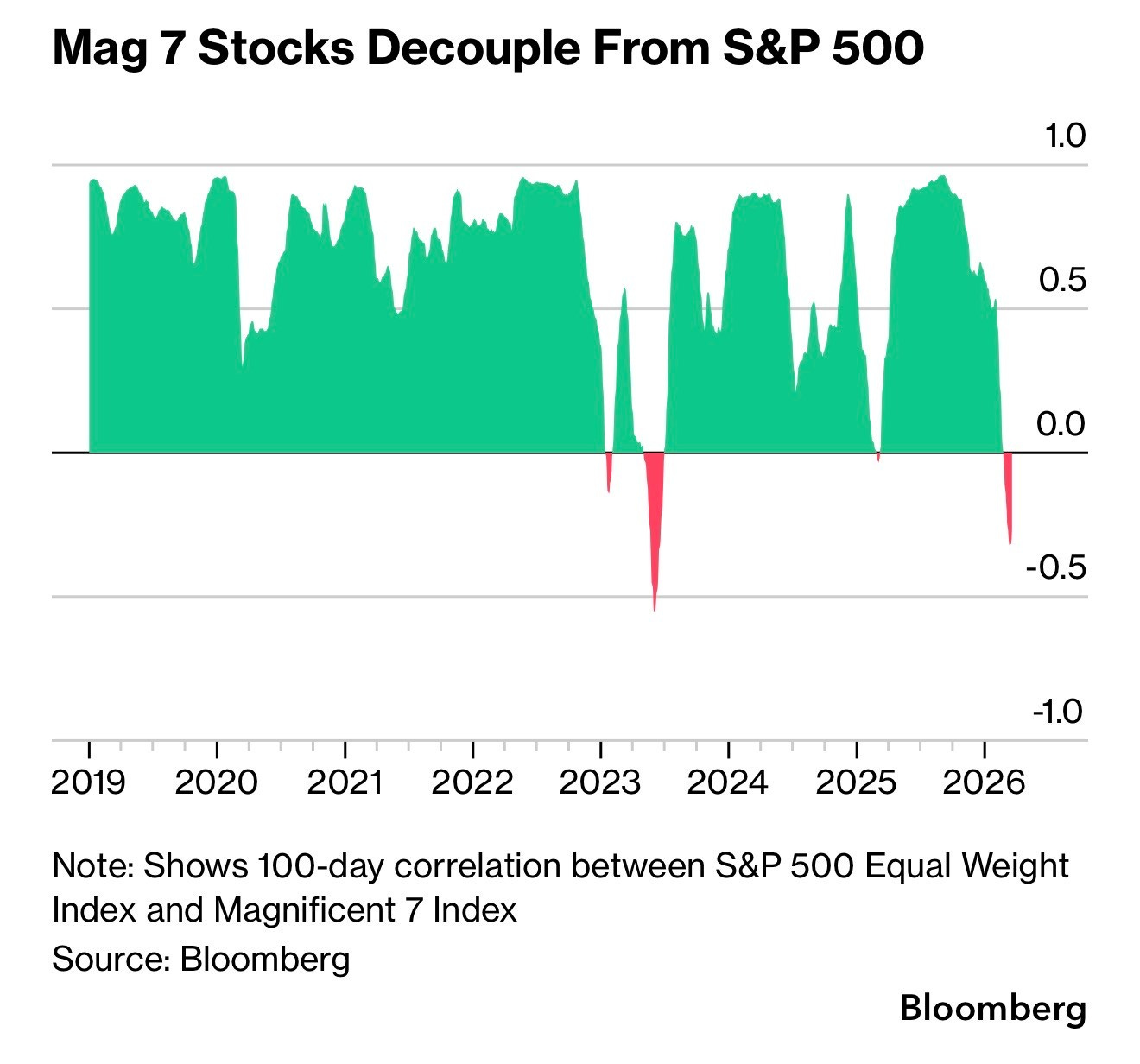 İlginç ama bence orta/uzun vadede sağlıklı bir gelişmede eşit ağırlıklı S&P 500 endeksi ve muhteşem yedili arasındaki 100 günlük korelasyonda var. Geçmişte bu durum bir süre S&P 500’e olumsuz yansıdıktan sonra “teknoloji liderliğinde” sağlam bir ralliye sebebiyet vermişti.