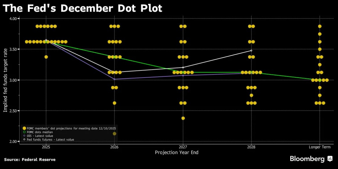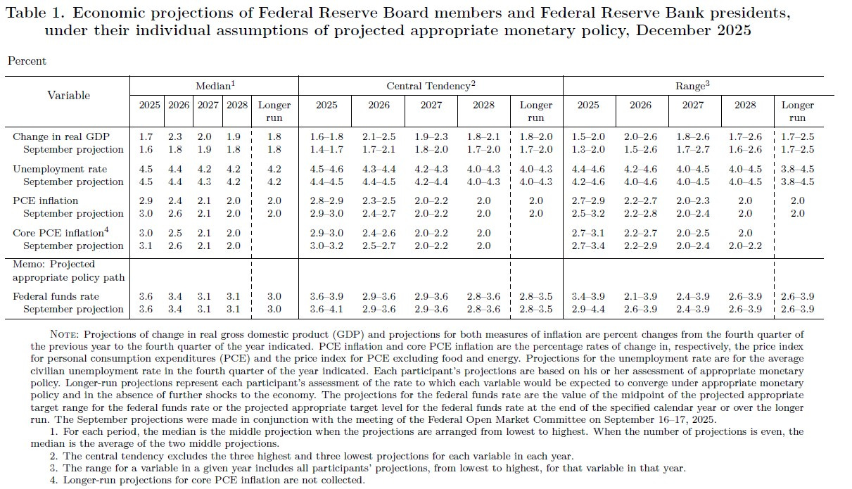 2026 için 4 üye 1 faiz indirimi öngörüyor. Bunun medyan olmasının sebebi geri kalanlarda yaşanan ayrışma… 8 üye 2 (veya daha fazla) ve 7 üye aynı (veya faiz artışı?!!!) öngörüyor… Son yazdığım taraf basın toplantısında da konuşuldu. 2026 yılı için 3 üye faiz artışı bekliyor gibi gözükse de aslında “toplantı öncesi” ekonomik beklentilerin (Nokta grafikte dahil) paylaşıldığı ve resmi olarak itiraz etmeselerde “içlerinden karara katılmak pek gelmeyen” üyeler olduğunu atlamayalım… Nokta grafiği de analiz ederken lütfen 1. maddeyi (İtirazlar) aklınızda tutun. Sonuç olarak basın toplantısında Powell kimsenin baz senaryosunda 2026 yılında faiz artışı yok dedi ve tartışmaları bitirdi…