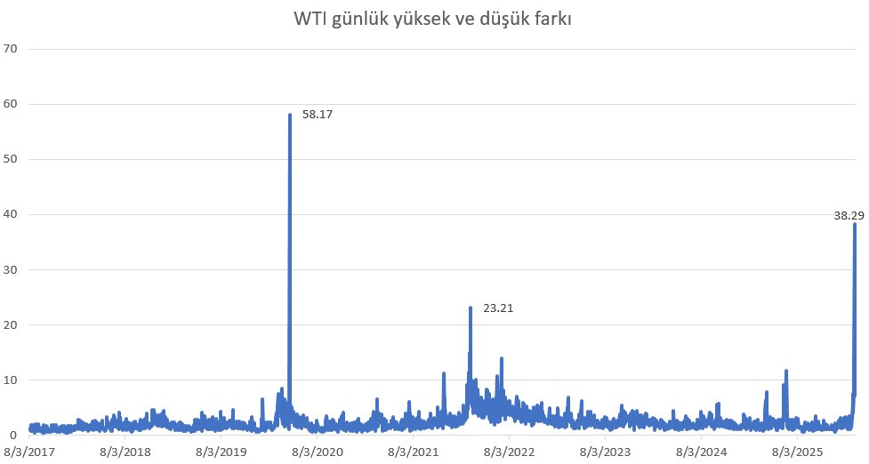 İçinde bulunduğumuz hafta başlangıcında WTI ve Brent petrol fiyatlarında günlük “yüksek ve düşük” farkı da tarihi boyutta gerçekleşti.