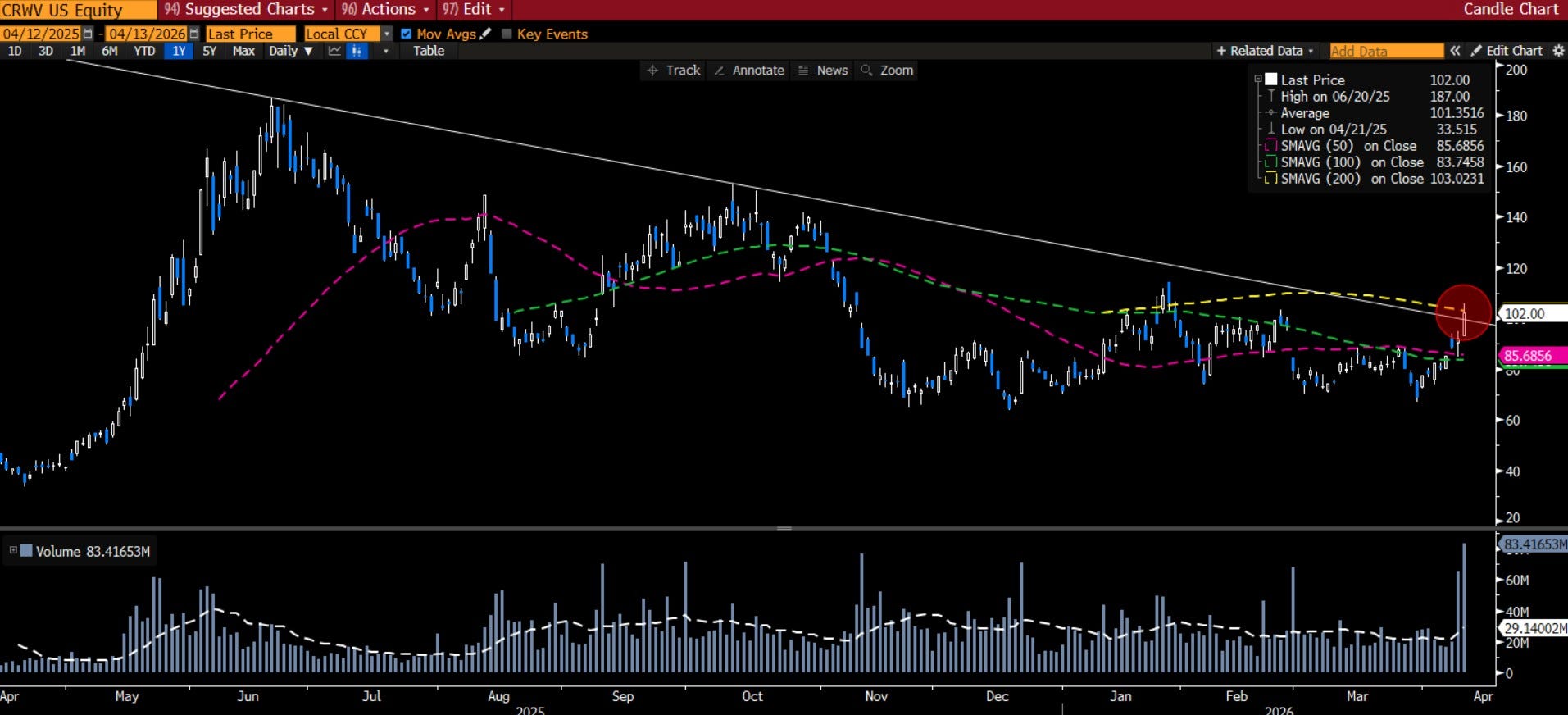 SOX endeksinde olmasa da yapay zeka fabrikaları tarafında takip ettiğim (Meta deal’ının büyümesi sonrası da işlem fikri paylaştığım) CoreWeave geçtiğimiz hafta %24 prim yaptı. Hedefi de gördü. Teknik resim de güzelleşti.