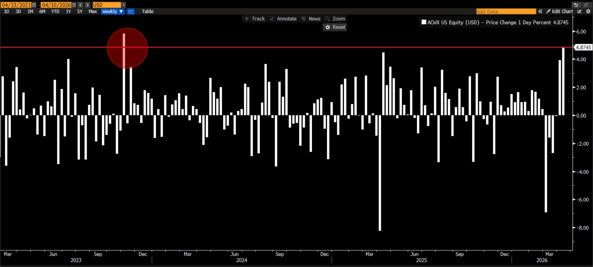 - Geçtiğimiz hafta ateşkes haberi nedenli ABD dışı borsalarda da iyi performans vardı. MSCI ACWI-USA geçtiğimiz hafta nerdeyse %5 artış yaşadı. Hafta sonu haber akışları ateşkesten kalıcı bir barışa geçmenin kolay bir süreç olmadığını gösterdi. Eğer kalıcı bir barış olmazsa: ABD endeksleri “overperformance”. Kalıcı bir barış olursa (Hürmüz trafiği normalleşir, petrol volatilitesi düşer ve ABD asker sayısı bölgede azalır) MSCI ACWI-USA yükseliş trendine devam eder…
