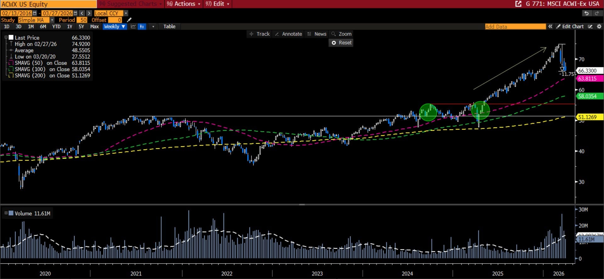 - Gelişmekte olan piyasalar fonu (EEM) 2026 yılının ilk iki ayında “tarihinin” en iyi başlangıcını yaptıktan sonra neredeyse bütün 2026 primini sildi… İyi taraf: Hala eksiye geçmedi. Kötü taraf: OVX yüksek kalmaya devam eder, “enerji maliyetleri-enflasyon riskleri-para politikaları seçimleri” denklemi hisse piyasasına destek olmayacaksa ve global büyüme için aşağı yönlü riskler artacaksa,ABD dışı hisse piyasalarında 2025 ile gördüğümüz olumlu ayrışma hikayesi ciddi risk altına girer…