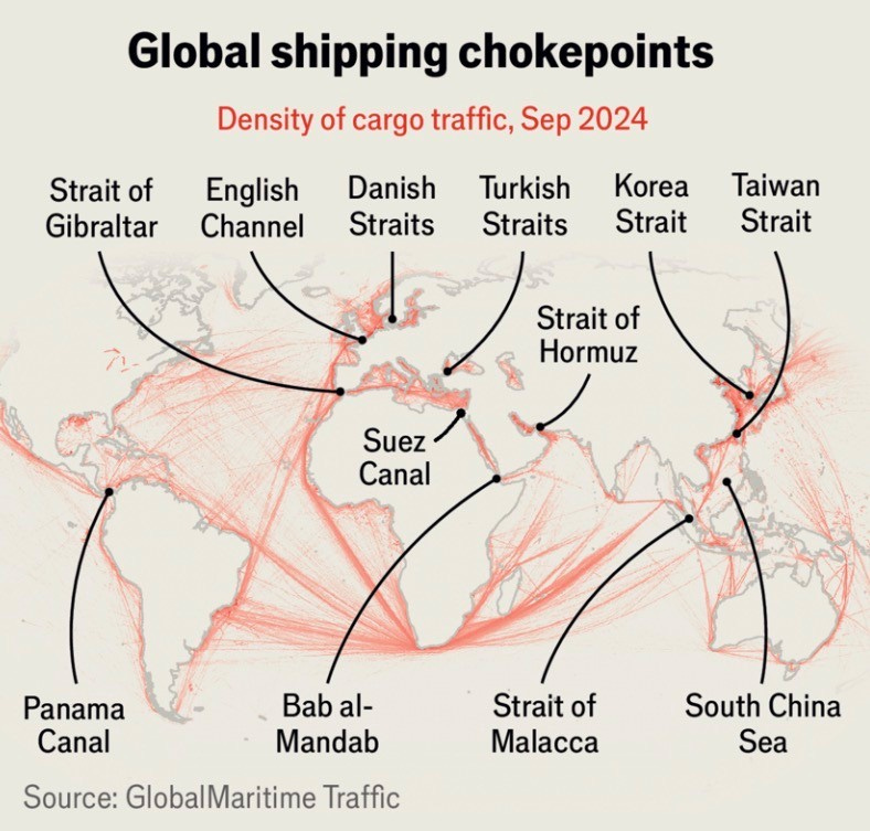 - Ortadoğu sonrası herkesin genel yorumu Tayvan sırada mı şeklinde olsa da bence Hürmüz dışında “chokepoint’ler/darboğazlar neler” sorusu daha kritik. The Economist güzel bir grafik yapmış. Dünya hem düşündüğümüzden daha küçük hem de çok daha kırılgan… Global ticaret sistemlerini öyle hızlıca oldu bitti şeklinde değiştirmemek herkesin işine gelir. Diğer türlü herkes (mi?) kaybeder…