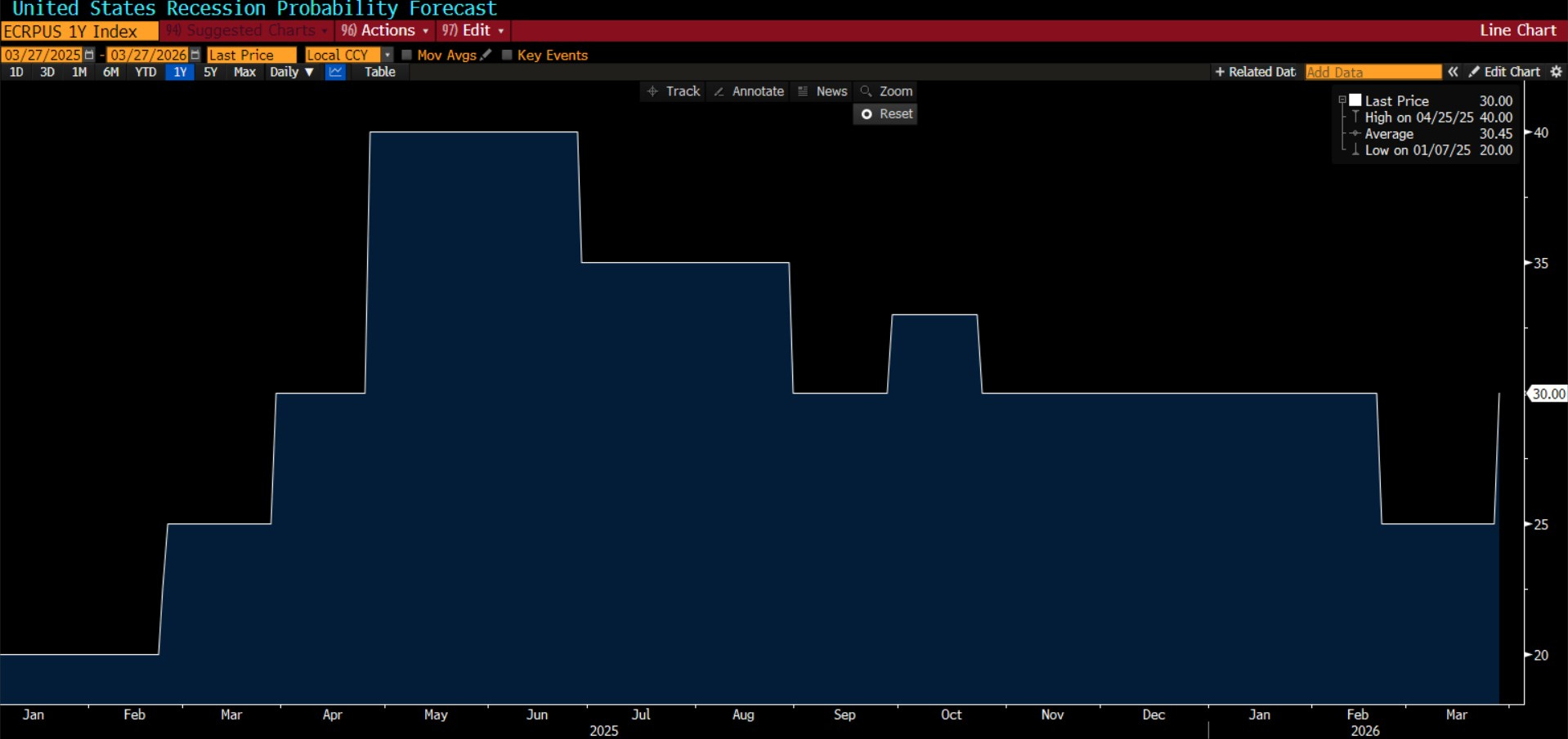 - Asıl olay: ABD büyümesi/istihdamı bu süreçten nasıl etkilenecek. Belki size çok ilginç gelir ama Bloomberg’den aldığım resesyon olasılıklarında hala durum 2025 ikinci çeyrekten daha iyi… Yani ekonomistler açısından ABD’de resesyon riskleri “liberation day” sonrası çok daha fazlaydı…