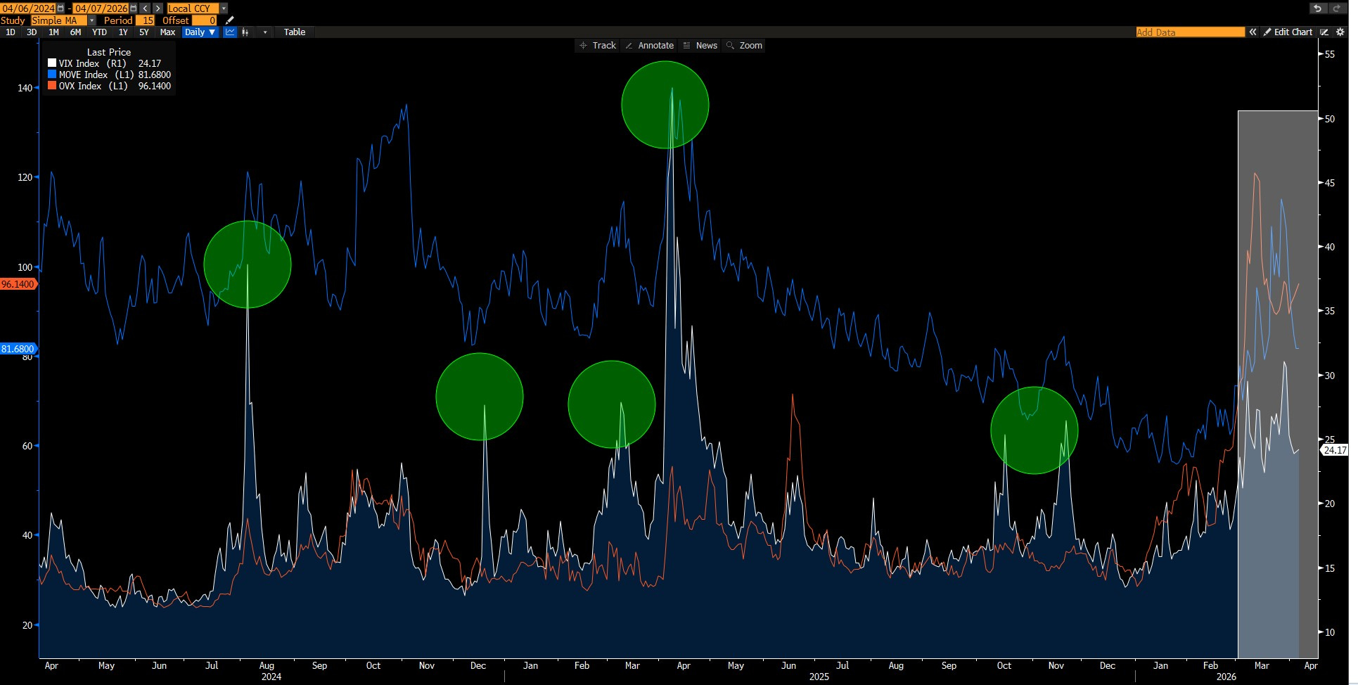 Vix (Hisse-Beyaz), Move (Tahvil-Mavi) & OVX (Petrol-Turuncu) volatilitesi günlük grafiği aşağıda. Beyaz alan savaş sonrası…