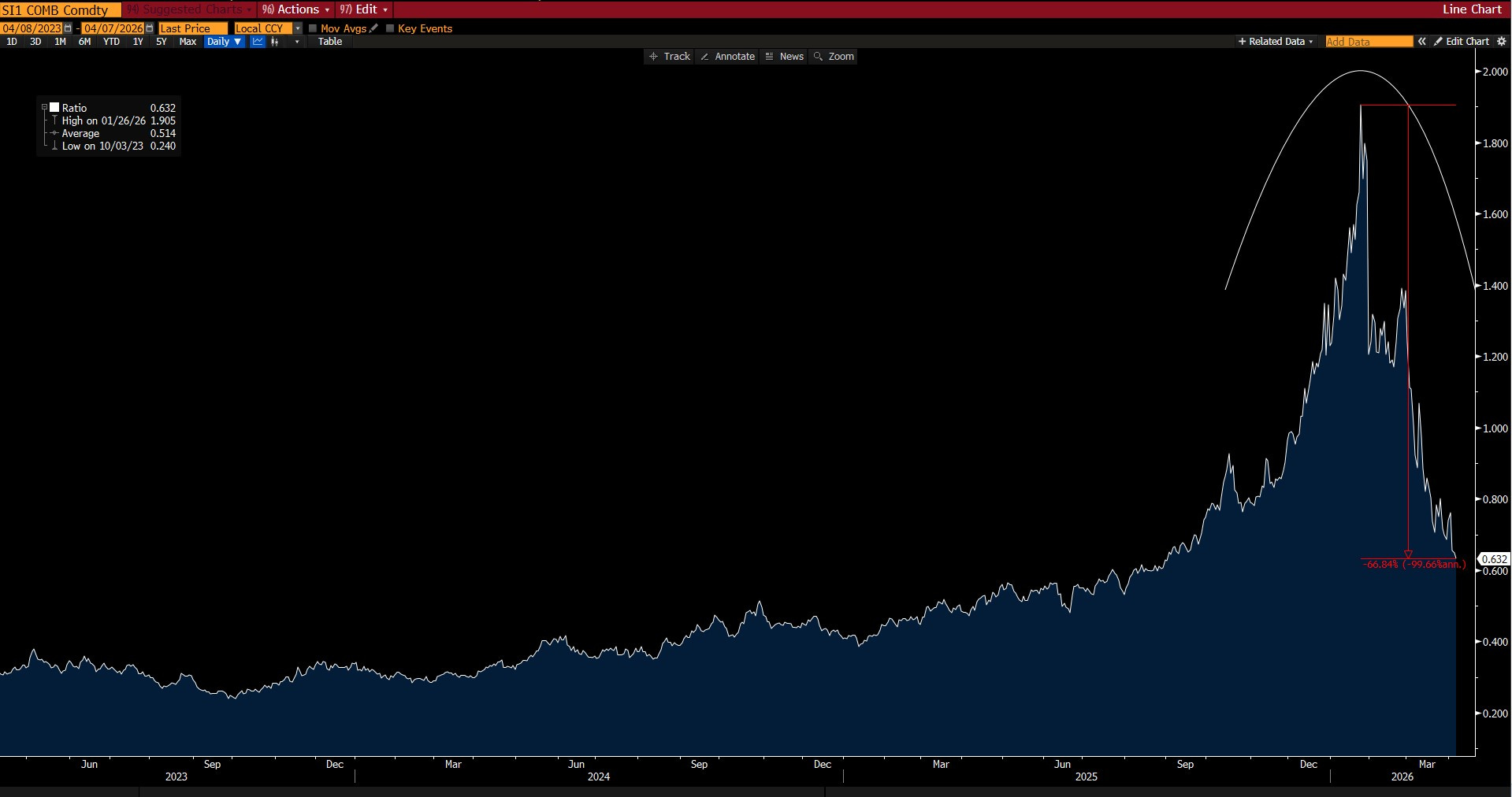 - Gümüş/WTI Petrol grafiğinde Q4’25 ve Ocak 2026 çılgınlık süreciydi…