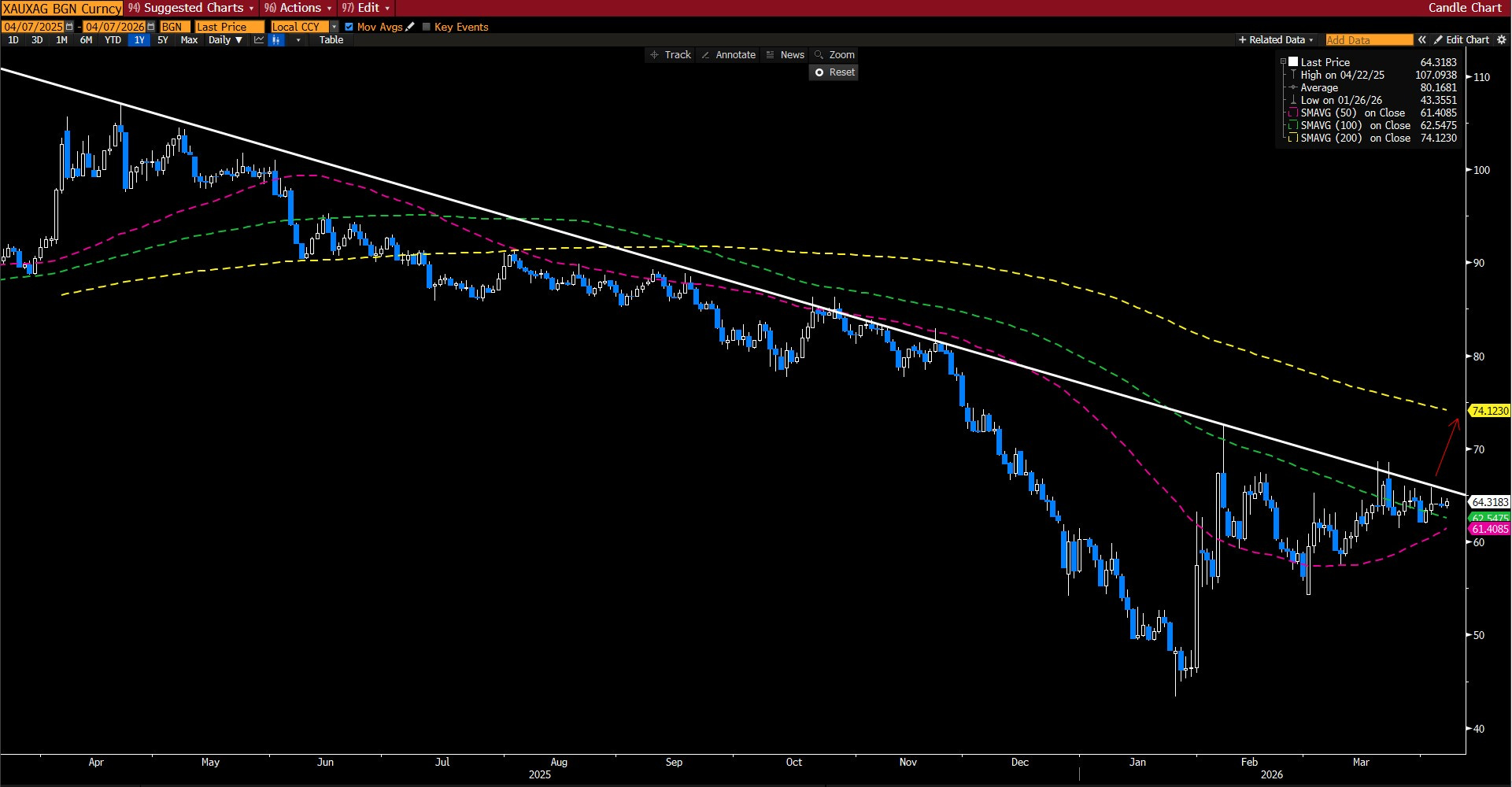 Diğer bi örnek: Altın/Gümüş… Bu oranda da 100 gho’nın üzerinde işlemler devam ediyor. Aşağıdaki grafikte düşüş trendinin yukarı yönlü kırılması da değerli metallerde satışları bence arttırabilir…