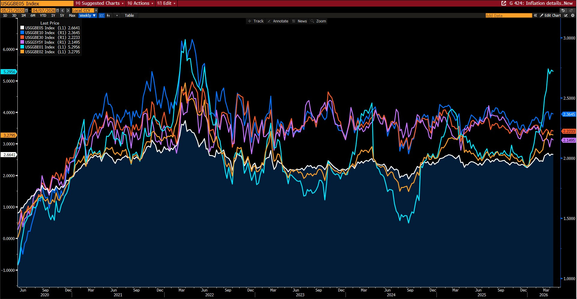 Bütün bu süreçte “enerji maliyetlerinin” artması ile ABD tarafında görece kısa vadeli (1 ve 2 yıl) enflasyon beklentilerine dair fiyatlamlar da artarken orta uzun vadeliler hala %2 beklentisine paralel.