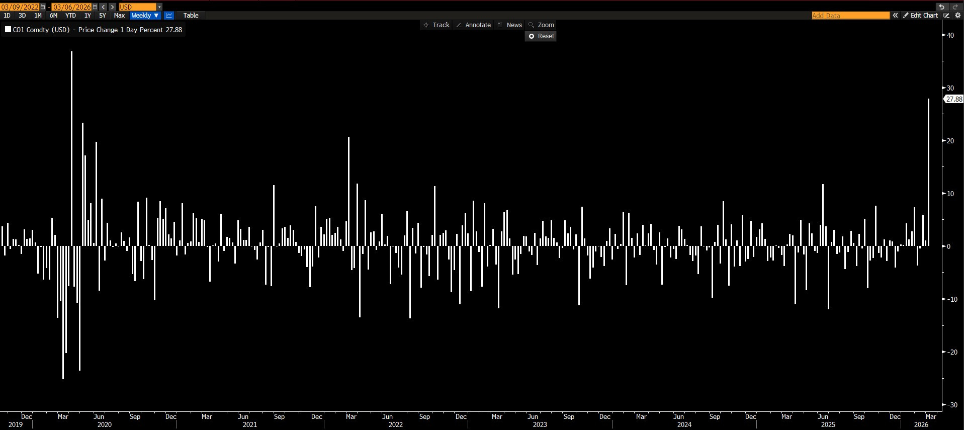 - Brent petrol %28 prim yaptı. Haftalık bazda baktığımızda 2020’den beri en sert yükseliş. 1989 yılından beri de ikinci en sert yükselişi. Körfez savaşında bile haftalık bazda böyle hareket etmemişti. Mart 2022’de %21’lik haftalık yükselişi olmuştu.
