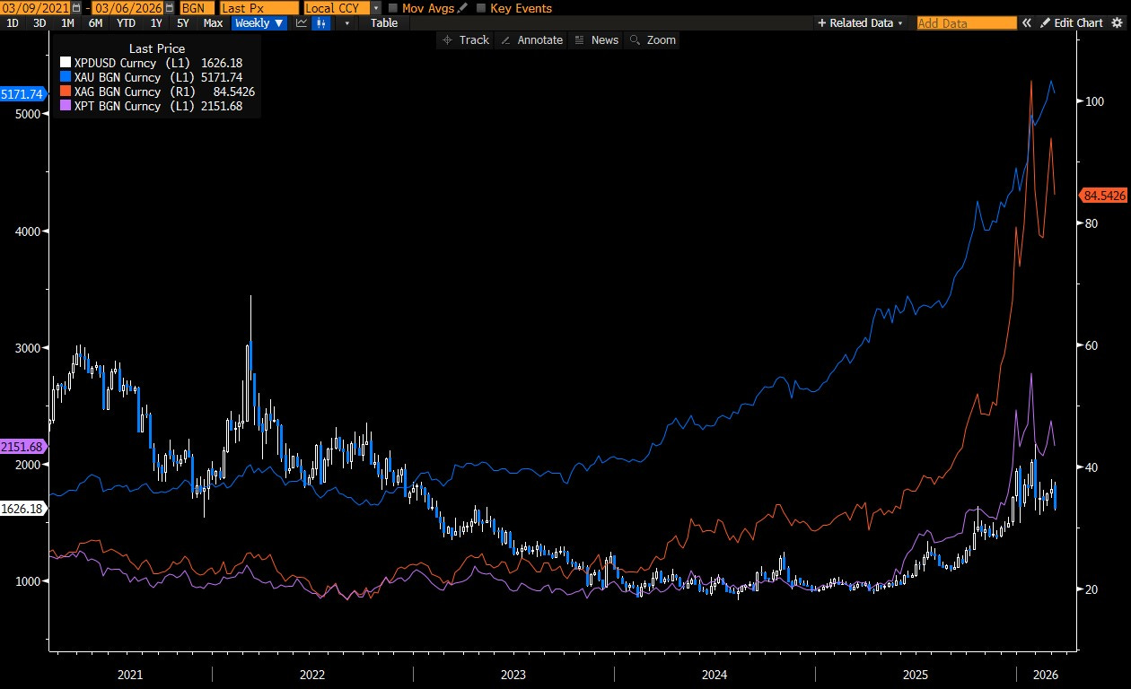 Altın, gümüş, platin ve paladyum haftalık grafik:
