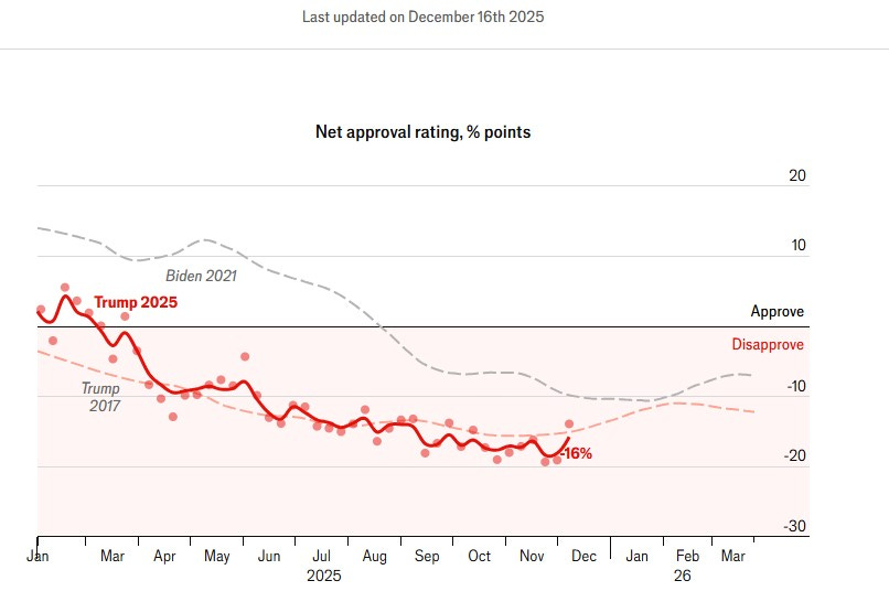 - ABD’de ara seçimlere giderken Trump’ın kamuoyu güveni ilk döneminin de aşağısında.“Dealmaker” unvanına ek olarak “Peacemaker” eklemek ara seçimlere giderken Cumhuriyetçi Parti’nin önem verdiği bir konu… Tarihsel olarak zaten ara seçimlerde “kırmızı dalganın” devamlılığı görece düşük bir olasılık. Ekonomik politikalarının da (Dealmaker unvanı) etkisine dair bu hafta WSJ’a verdiği röportaj önemli. Elde kalan seçenekler arasında “Demokratlar zamanında başlayan savaş bitti” cümlesi ara seçimlerde olasılıkları değiştirebilir.