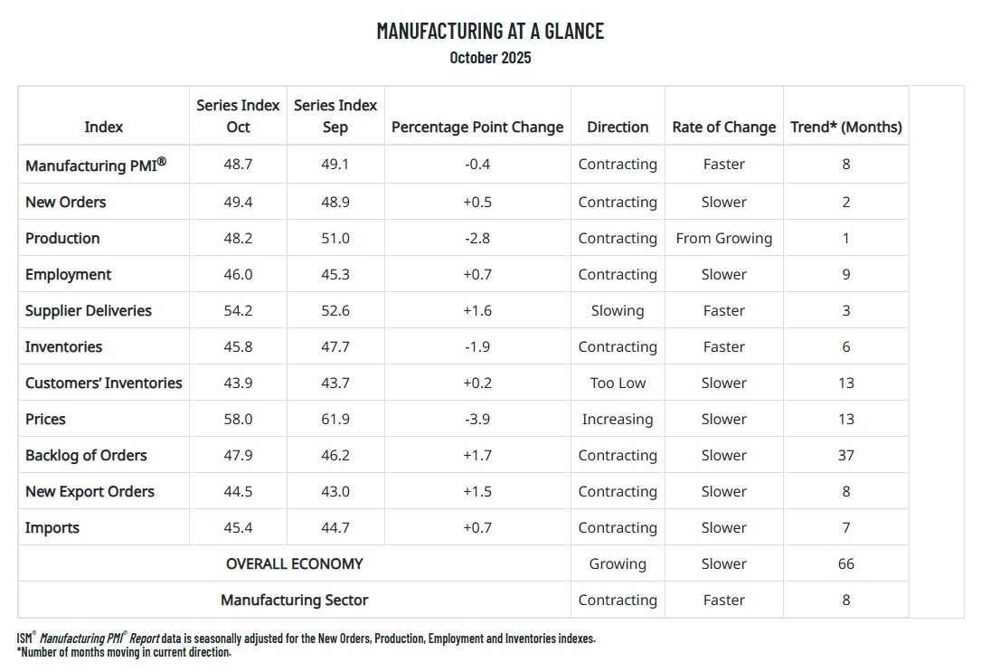- ABD tarafından veri akışlarının düşük frekansta devam ettiği dönemde ISM imalat verisini aldık. İmalat sektörü Ekim ayında daralma bölgesinde. https://www.ismworld.org/supply-management-news-and-reports/reports/ism-pmi-reports/pmi/october/