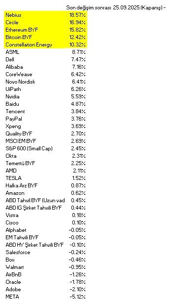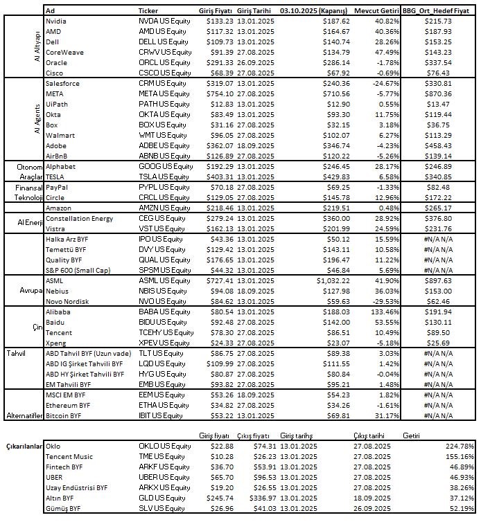 - Uluslararası piyasalar listesinin son güncellemesini 25 Eylül kapanış fiyatlarından gerçekleştirdim. 25.09.2025 – 03.10.2025 arası getirisi %3.8 oldu. Son değişim sonrası en çok katkı Avrupa tarafından (Nebius) ve alternatiflerden (Bitcoin ve Ethereum) geldi. Stablecoin tarafında aldığımız hisse pozisyonu Circle da çok iyi bir katkıda bulundu.