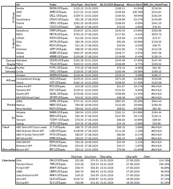 - UiPath’de dün kapanış sonrası uzun zamandır satış baskısı gördüğü direnç geçildi. Hisse Q2 finansalları sonrasında getirisi %50’nin üzerine seans sonrası çıktı. AI Agents temamda da toplam getirisi %21 (13 Ocak – 8 Ekim). AI Agents temasında bulunan Adobe ve Salesforce’da da Q4 içinde sağlam yükselişler yaşayacağımızı düşünüyorum.